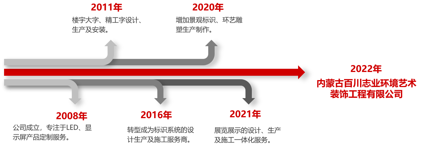 公司在2008年成立后,本著“以客戶需求為核心,用心服務(wù)”的理念,為眾多客戶提供LED、顯示屏產(chǎn)品定制服務(wù);在經(jīng)歷了創(chuàng)業(yè)初期后,自2011年開始,公司增加樓宇大字及精工字的生產(chǎn)安裝,為一眾客戶提供服務(wù)的同時(shí)也得到了客戶及行業(yè)內(nèi)的廣泛認(rèn)可;伴隨著中國(guó)經(jīng)濟(jì)的高速發(fā)展和各企業(yè)單位的需求, 公司于2016年開始轉(zhuǎn)型成為標(biāo)識(shí)系統(tǒng)的設(shè)計(jì)生產(chǎn)及施工服務(wù)商;隨后分別又于2020年、2021年新增景觀標(biāo)識(shí)、環(huán)藝雕塑、展覽展示的策劃、設(shè)計(jì)及施工一體化服務(wù)。 多年來,經(jīng)過不斷的思維創(chuàng)新及技術(shù)完善,逐步成為內(nèi)蒙古地區(qū)專業(yè)的廣告標(biāo)識(shí)服務(wù)公司,為行業(yè)的高質(zhì)量發(fā)展添磚加瓦。 與此同時(shí),公司團(tuán)隊(duì)不斷壯大,主要骨干都是從事廣告行業(yè)5年以上的專業(yè)人才,從設(shè)計(jì)、制作到安裝,根據(jù)客戶的不同需求,提供無微不至的服務(wù)。